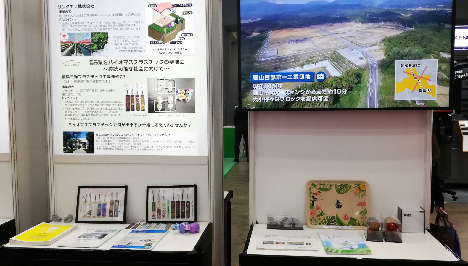 単なる一企業としての参加ではなく、「郡山市の環境技術」をアピールする役割を担い、環境に優しい原料で作った製品を展示いたしました。
